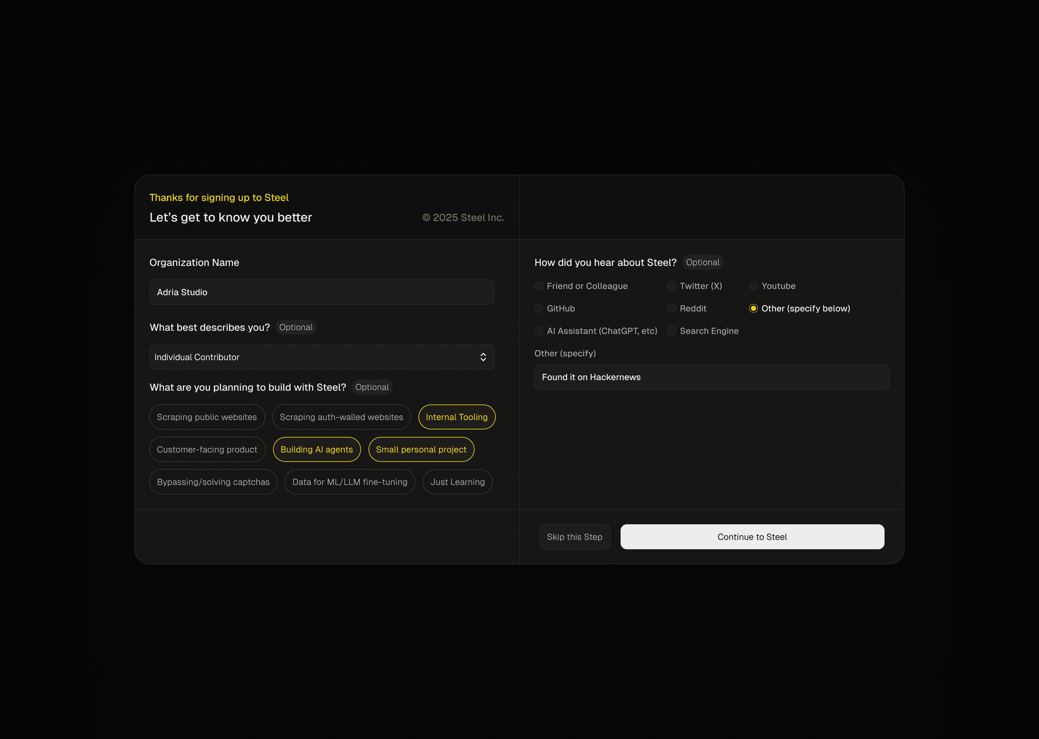 We rebuilt Steel from the ground up — refreshing the entire product, redesigning the website, and handling everything from launch-week content to brand guidelines and social assets.